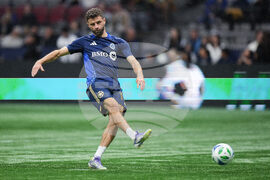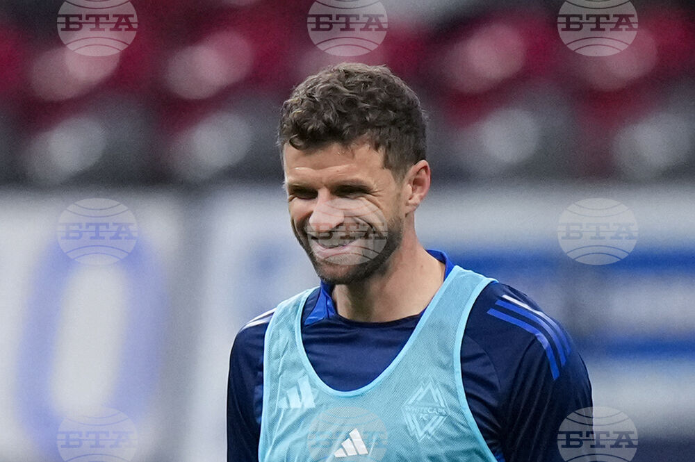 Vancouver Whitecaps' Thomas Muller warms up before an MLS soccer match against FC Dallas in Vancouver, British Columbia, Saturday, Oct. 18, 2025. (Darryl Dyck/The Canadian Press via AP)