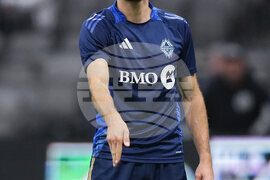 Vancouver Whitecaps' Thomas Muller gestures to a teammate while warming up before an MLS soccer match against FC Dallas in Vancouver, British Columbia, Saturday, Oct. 18, 2025. (Darryl Dyck/The Canadian Press via AP)