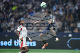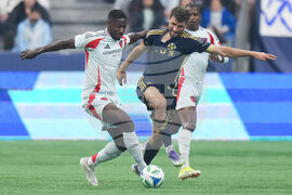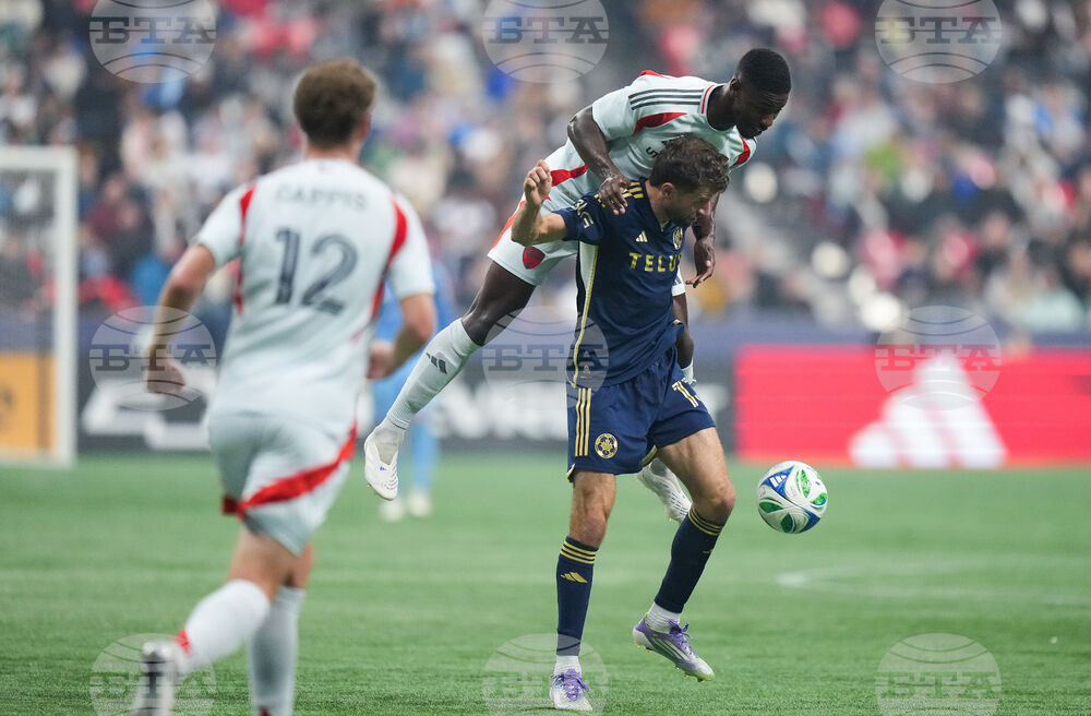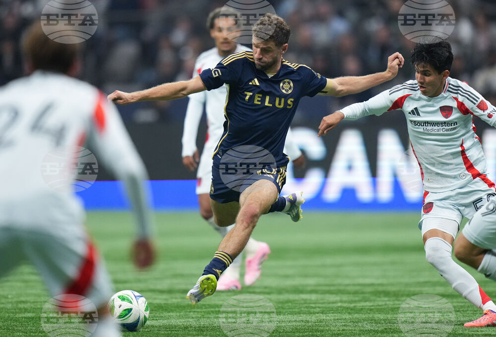 FC Dallas' Osaze Urhoghide, left, and Vancouver Whitecaps' Thomas Muller vie for the ball during the second half of an MLS soccer match, in Vancouver, on Saturday, Oct. 18, 2025. (Darryl Dyck/The Canadian Press via AP)