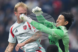 Vancouver Whitecaps goalkeeper Yohei Takaoka, right, follows through after punching the ball away from FC Dallas' Samuel Sarver, left, during the first half of an MLS soccer match in Vancouver, British Columbia, Saturday, Oct. 18, 2025. (Darryl Dyck/The Canadian Press via AP)