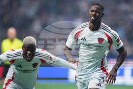 FC Dallas' Osaze Urhoghide, right, and Bernard Kamungo , left, celebrate after Urhoghide's goal against the Vancouver Whitecaps during the first half of an MLS soccer match in Vancouver, British Columbia, Saturday, Oct. 18, 2025. (Darryl Dyck/The Canadian Press via AP)