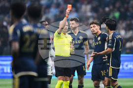 Referee Allen Chapman issues a red card to Vancouver Whitecaps' Mathias Laborda, front right, as Thomas Muller, back center, and Sebastian Berhalter, back right, look on during the first half of an MLS soccer match against FC Dallas in Vancouver on Saturday, Oct. 18, 2025. (Darryl Dyck/The Canadian Press via AP)
