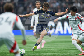 Vancouver Whitecaps' Thomas Muller, center, shoots on goal as FC Dallas' Diego Garcia, right, defends during the second half of an MLS soccer match in Vancouver, British Columbia, Saturday, Oct. 18, 2025. (Darryl Dyck/The Canadian Press via AP)