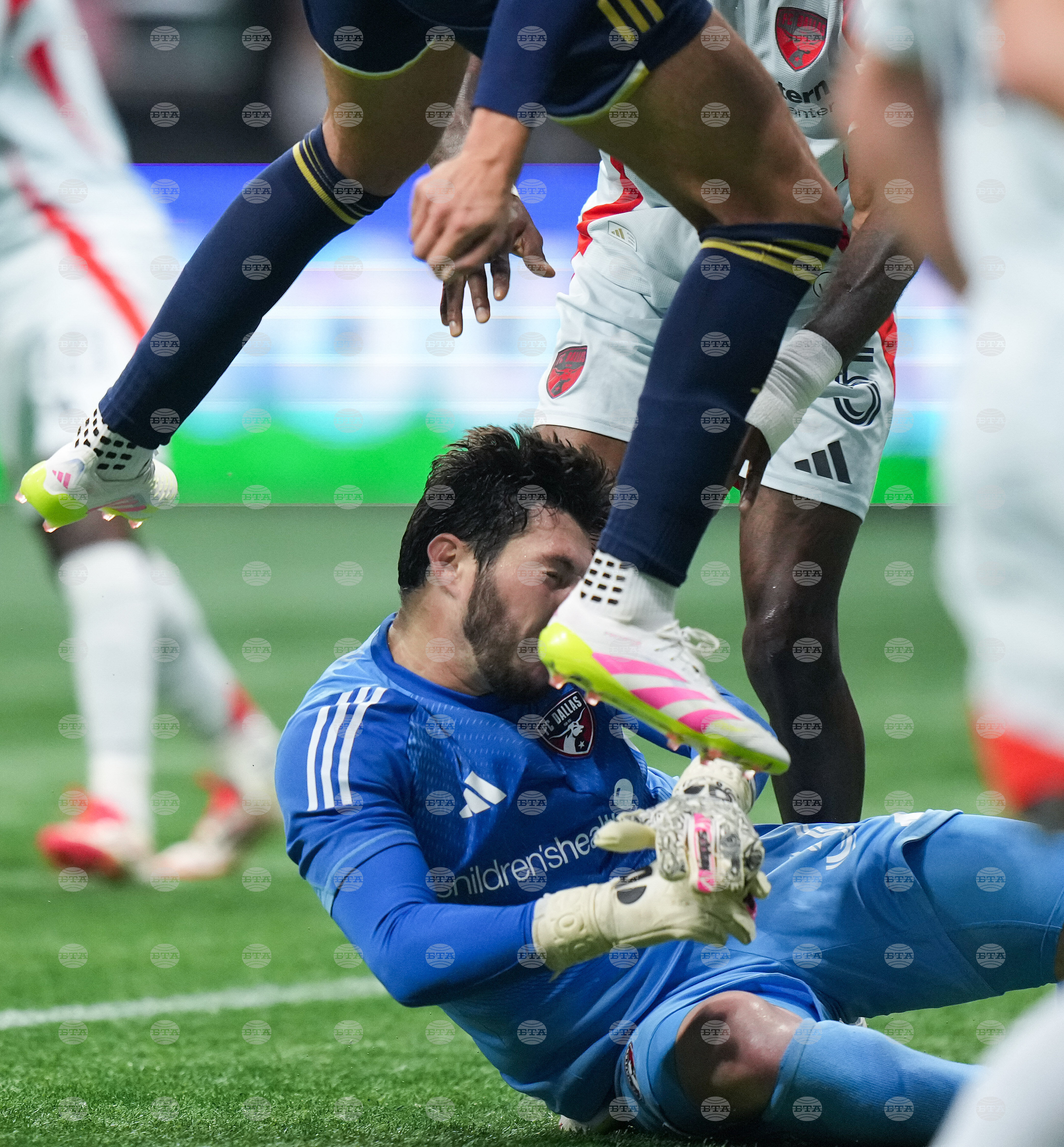 Vancouver Whitecaps goalkeeper Yohei Takaoka falls after making a save during the first half of an MLS soccer match against FC Dallas, in Vancouver, on Saturday, Oct. 18, 2025. (Darryl Dyck/The Canadian Press via AP)