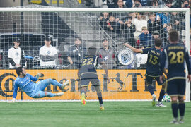 Vancouver Whitecaps' Thomas Muller (13) scores on a penalty kick against FC Dallas goalkeeper Michael Collodi (30) during the first half of an MLS soccer match, in Vancouver, on Saturday, Oct. 18, 2025. (Darryl Dyck/The Canadian Press via AP)