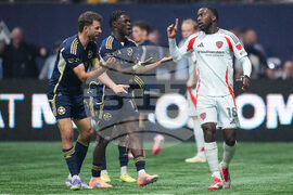 Vancouver Whitecaps' Thomas Muller, left, and Emmanuel Sabbi, second left, argue with FC Dallas' Shaq Moore during the second half of an MLS soccer match, in Vancouver, on Saturday, Oct. 18, 2025. (Darryl Dyck/The Canadian Press via AP)