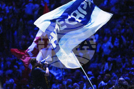 A Vancouver Whitecaps supporter uses a bullhorn to lead others in a chant before an MLS soccer match against FC Dallas, in Vancouver, on Saturday, October 18, 2025. (Darryl Dyck/The Canadian Press via AP)