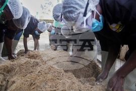 Workers process agricultural waste for use in building house wall and roof insulation at the MycoTile facility at the Kenya Industrial Research and Development Institute in Nairobi, Kenya, Thursday, July 24, 2025. (AP Photo/Brian Inganga)