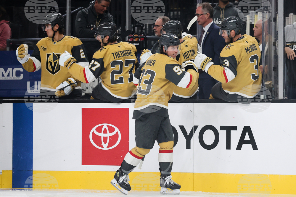 Vegas Golden Knights right wing Mitch Marner (93) celebrates with teammates after scoring against the Calgary Flames during the first period of an NHL hockey game Saturday, Oct. 18, 2025, in Las Vegas. (AP Photo/Ian Maule)