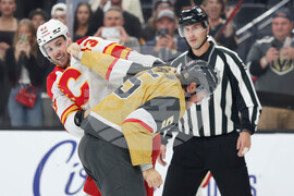 Calgary Flames right wing Adam Klapka (43) and Vegas Golden Knights defenseman Jeremy Lauzon (5) fight during the first period of an NHL hockey game Saturday, Oct. 18, 2025, in Las Vegas. (AP Photo/Ian Maule)