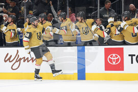 Vegas Golden Knights right wing Mark Stone (61) reacts after scoring a goal against the Calgary Flames during the third period of an NHL hockey game Saturday, Oct. 18, 2025, in Las Vegas. (AP Photo/Ian Maule)