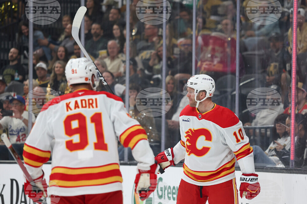 Calgary Flames left wing Jonathan Huberdeau (10) reacts after scoring against the Vegas Golden Knights during the first period of an NHL hockey game Saturday, Oct. 18, 2025, in Las Vegas. (AP Photo/Ian Maule)