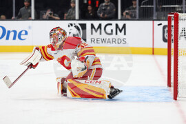 Calgary Flames goaltender Dustin Wolf (32) makes a save in front of defenseman Jake Bean (24) and Vegas Golden Knights center William Karlsson (71) during the second period of an NHL hockey game Saturday, Oct. 18, 2025, in Las Vegas. (AP Photo/Ian Maule)