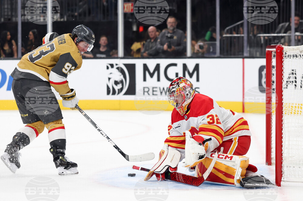 Vegas Golden Knights right wing Mitch Marner (93) scores a goal past Calgary Flames goaltender Dustin Wolf (32) during the second period of an NHL hockey game Saturday, Oct. 18, 2025, in Las Vegas. (AP Photo/Ian Maule)