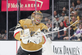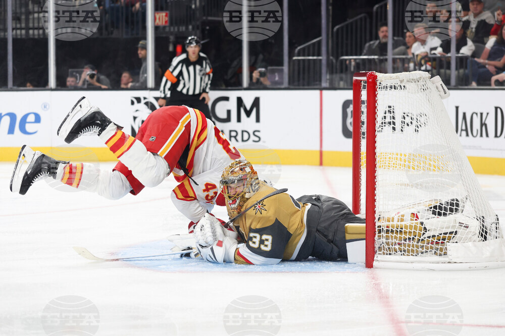 Vegas Golden Knights goaltender Adin Hill makes a save against the Calgary Flames during the first period of an NHL hockey game Saturday, Oct. 18, 2025, in Las Vegas. (AP Photo/Ian Maule)