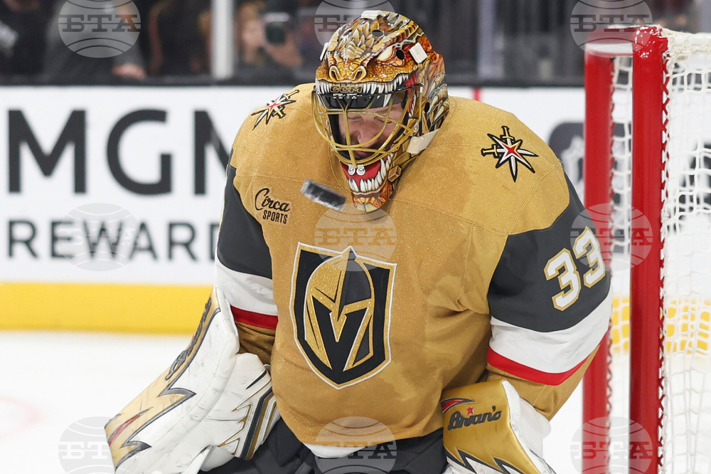 Vegas Golden Knights goaltender Adin Hill (33) deflects a puck during the third period of an NHL hockey game against the Calgary Flames Saturday, Oct. 18, 2025, in Las Vegas. (AP Photo/Ian Maule)