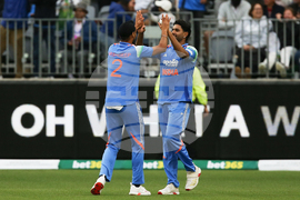 India's Ashdeep Singh celebrates with teammate Harshit Rana after he caught Travis Head during the one day international cricket match between Australia and India in Perth Australia, Sunday, Oct. 19, 2025. (David Woodley/AAPImage via AP)