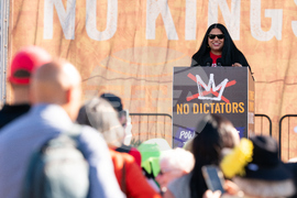 IMAGE DISTRIBUTED FOR NATIONAL NURSES UNITED - Puneet Maharaj, Executive Director, National Nurses United, speaking at the No Kings Rally in San Francisco on Saturday, October 18, 2025. (Don Feria/AP Content Services for National Nurses United)
