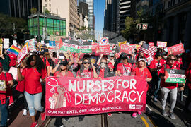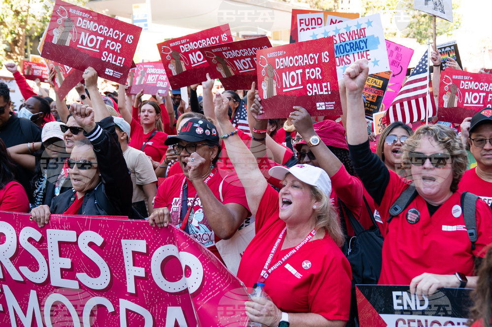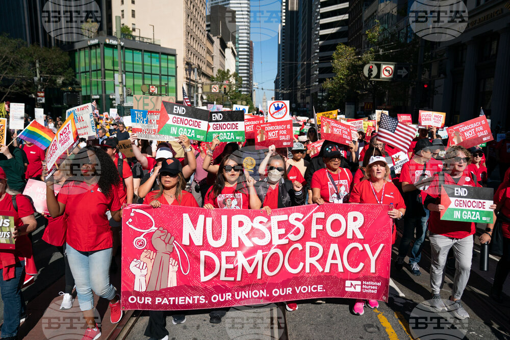 IMAGE DISTRIBUTED FOR NATIONAL NURSES UNITED -Registered nurses march against President Trump's authoritarian tactics at the Saturday, Oct. 18 No Kings Day of Defiance action organized by National Nurses United and Indivisible SF, in San Francisco, Calif. Trump's cruel immigration and transgender policies, elimination and reduction of Medicaid funding, and attacks on labor unions have been fiercely opposed by registered nurses. (Don Feria/AP Content Services for National Nurses United)