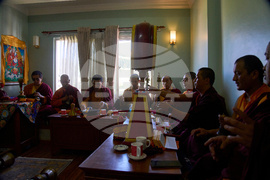 Buddhist monks perform rituals for Kanchha Sherpa, the last surviving member of the mountaineering expedition team that first conquered Mount Everest, as his body lies for final rites ahead of a funeral ceremony at his residence in Kathmandu, Nepal, Sunday, Oct. 19, 2025. (AP Photo/Niranjan Shrestha)