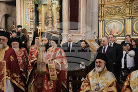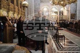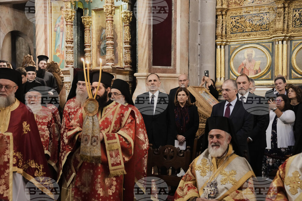 Greek Foreign Minister George Gerapetritis, center, attends Sunday mass at the Church of the Holy Sepulchre, where many Christians believe Jesus was crucified, buried and rose from the dead, in the Old City of Jerusalem, Sunday, Oct. 19, 2025. (AP Photo/Mahmoud Illean)