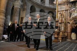Greek Foreign Minister George Gerapetritis, center, visits the Church of the Holy Sepulchre, where many Christians believe Jesus was crucified, buried and rose from the dead, in the Old City of Jerusalem, Sunday, Oct. 19, 2025. (AP Photo/Mahmoud Illean)