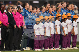 England's players stands for national anthem during the ICC Women's Cricket World Cup match between India and England in Indore, India, Sunday, Oct. 19, 2025. (AP Photo/Ajit Solanki)