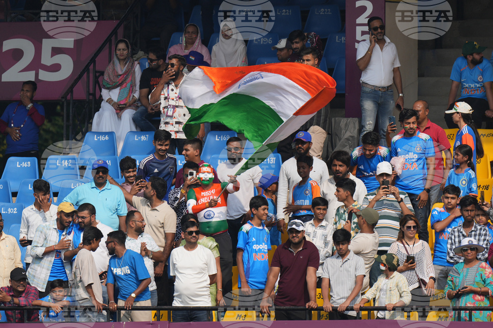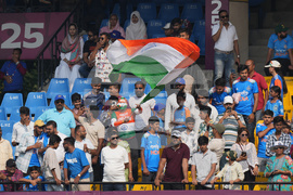 A fan waves India's national flag during the ICC Women's Cricket World Cup match between India and England in Indore, India, Sunday, Oct. 19, 2025. (AP Photo/Ajit Solanki)