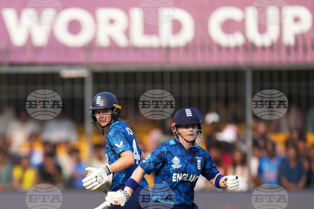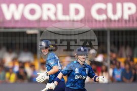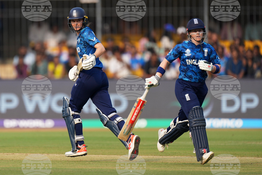 England's Amy Jones, left, and Tammy Beaumont run between the wickets during the ICC Women's Cricket World Cup match between India and England in Indore, India, Sunday, Oct. 19, 2025. (AP Photo/Ajit Solanki)