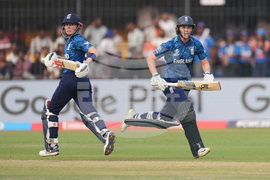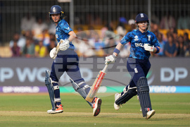 England's captain Nat Sciver-Brunt, right, and Heather Knight run between the wickets during the ICC Women's Cricket World Cup match between India and England in Indore, India, Sunday, Oct. 19, 2025. (AP Photo/Ajit Solanki)