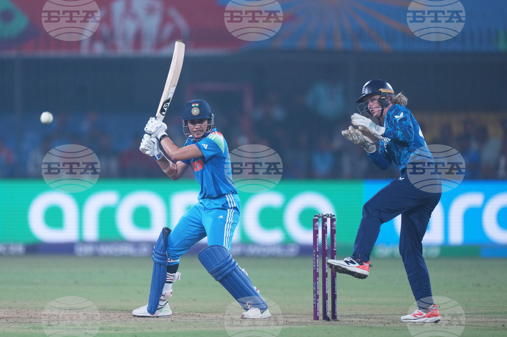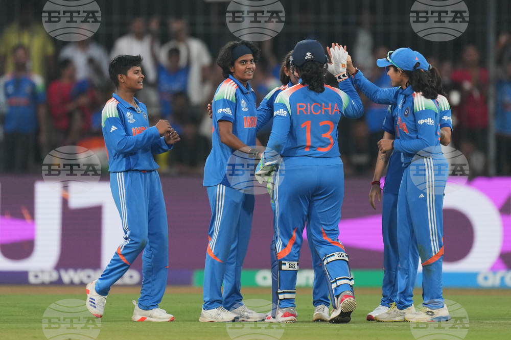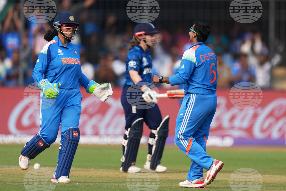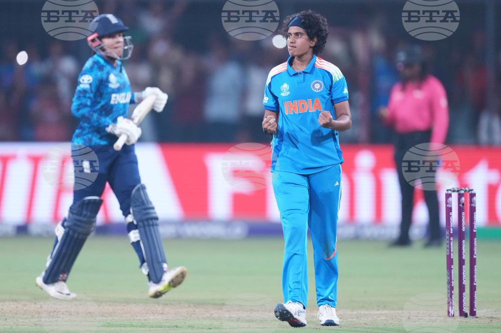 India's Shree Charani, left, celebrates with teammate the wicket of England's captain Nat Sciver-Brunt, right, during the ICC Women's Cricket World Cup match between India and England in Indore, India, Sunday, Oct. 19, 2025. (AP Photo/Ajit Solanki)