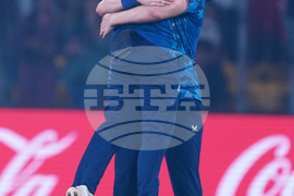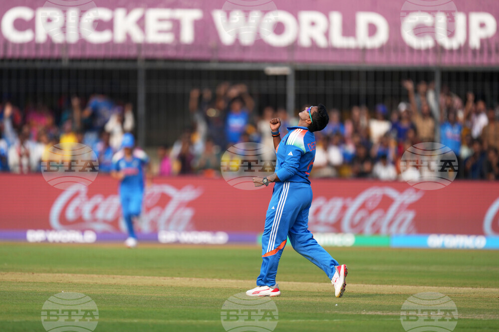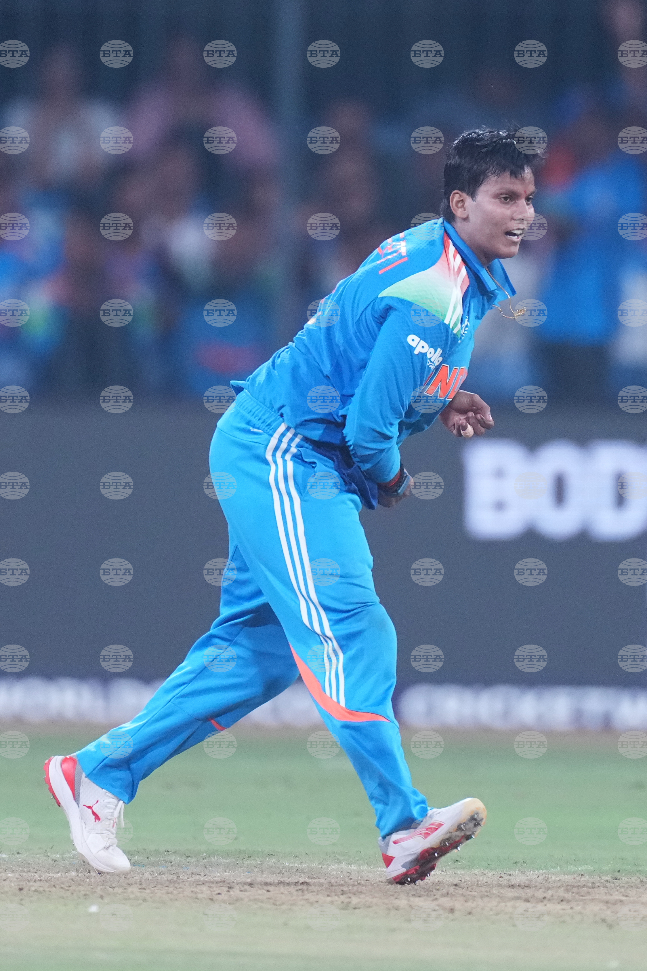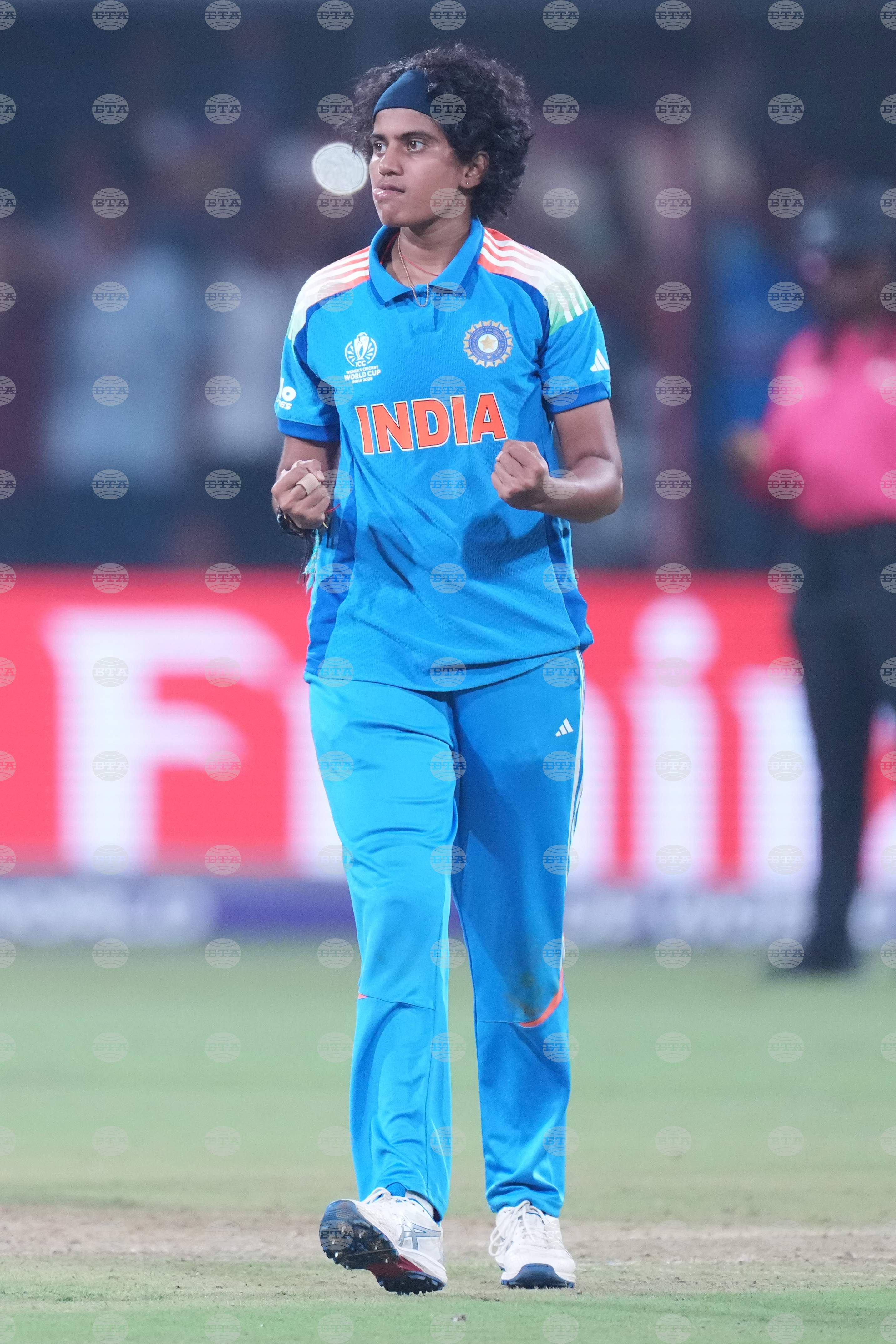 India's Shree Charani celebrates the wicket of England's Sophia Dunkley during the ICC Women's Cricket World Cup match between India and England in Indore, India, Sunday, Oct. 19, 2025. (AP Photo/Ajit Solanki)