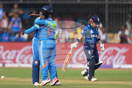 India's Deepti Sharma, left, and Smriti Mandhana celebrates the wicket of England's Amy Jones during the ICC Women's Cricket World Cup match between India and England in Indore, India, Sunday, Oct. 19, 2025. (AP Photo/Ajit Solanki)