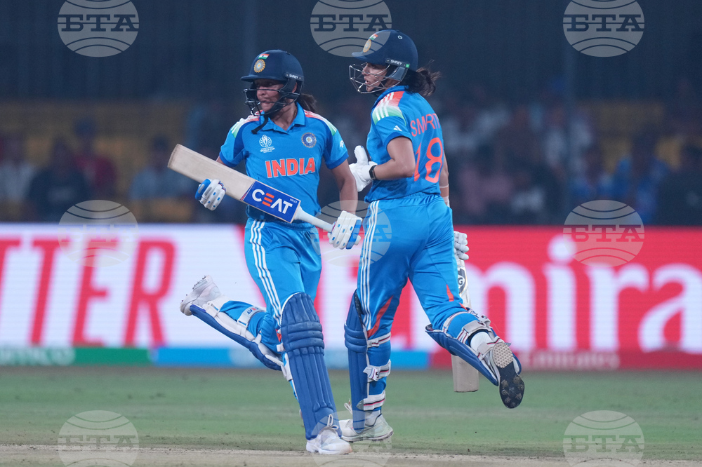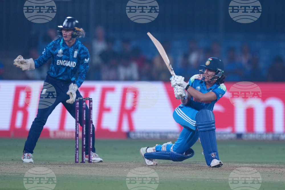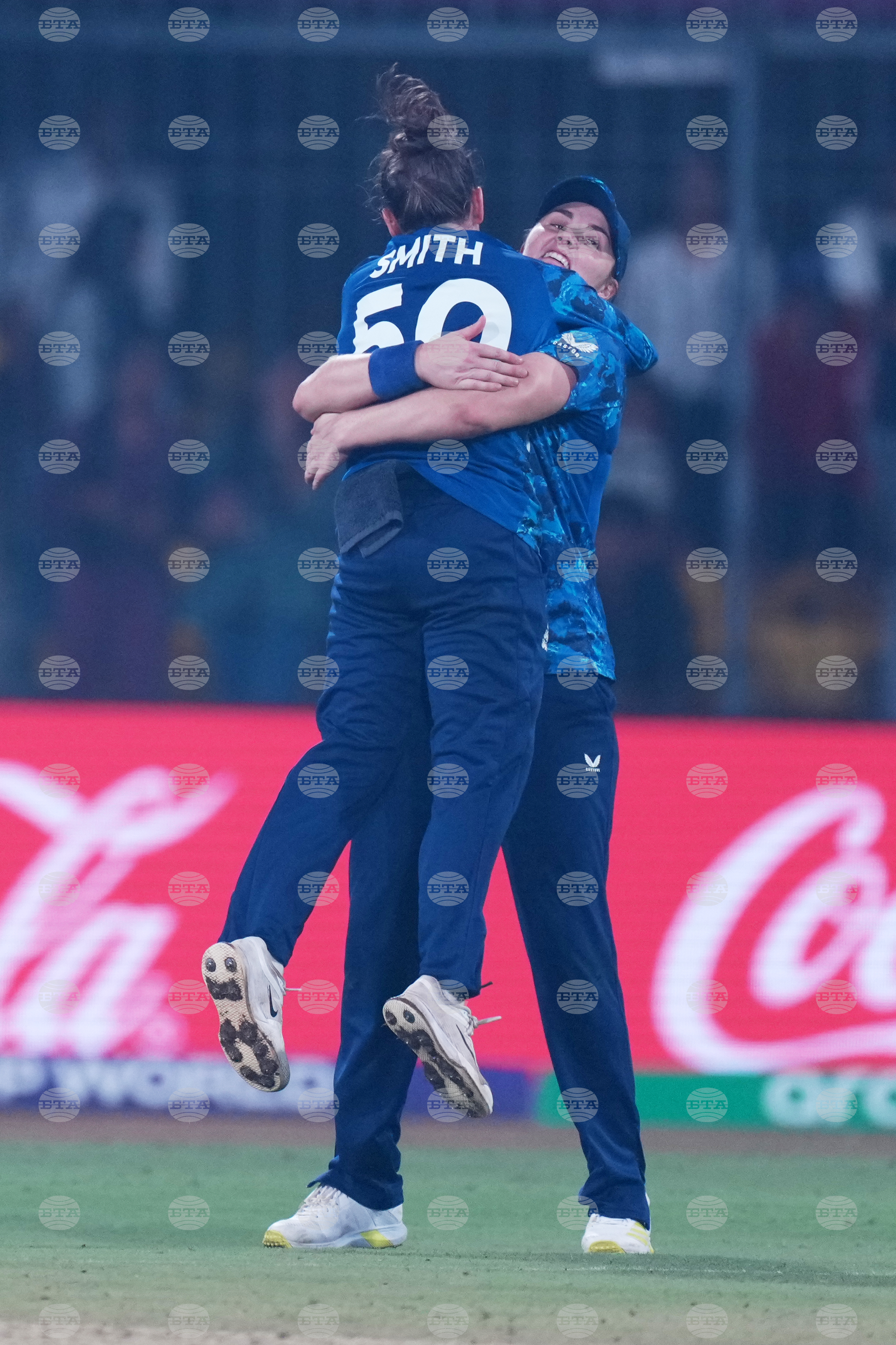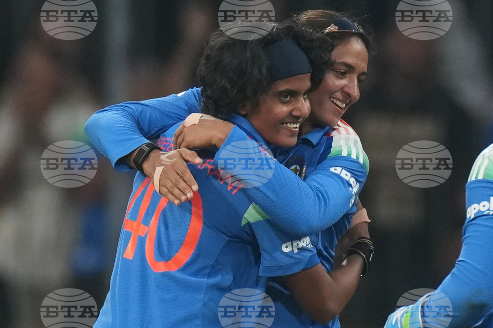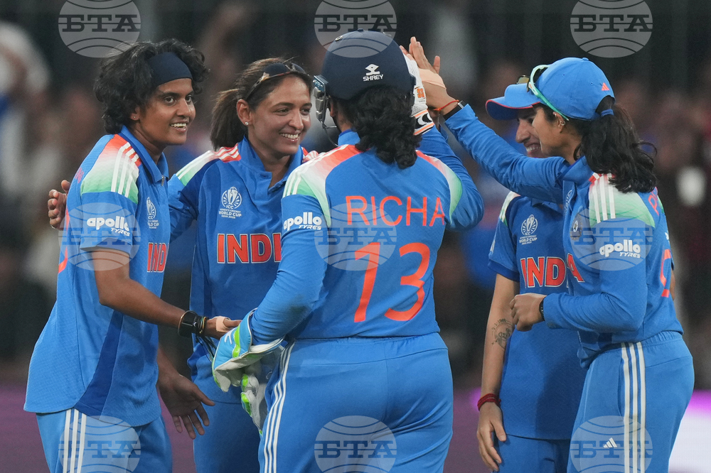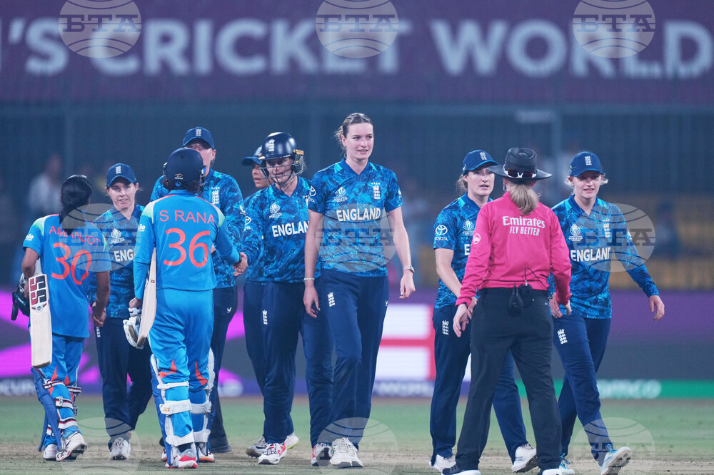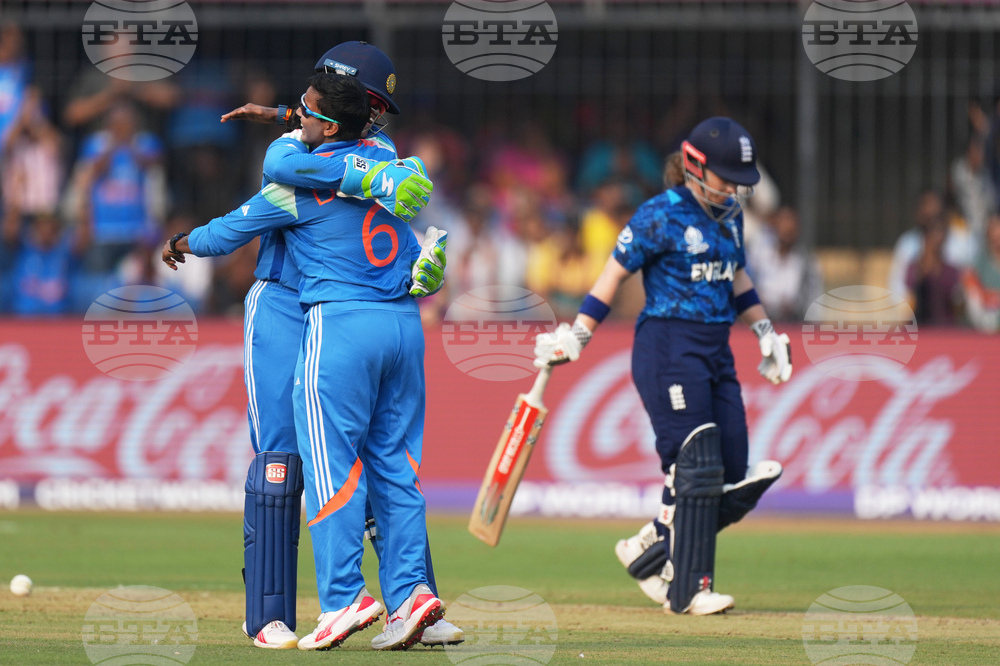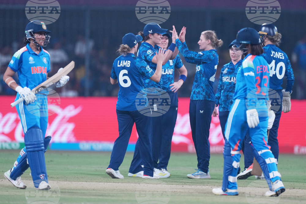 India's Shree Charani, left, and India's captain Harmanpreet Kaur celebrates the wicket of England's captain Nat Sciver-Brunt during the ICC Women's Cricket World Cup match between India and England in Indore, India, Sunday, Oct. 19, 2025. (AP Photo/Ajit Solanki)