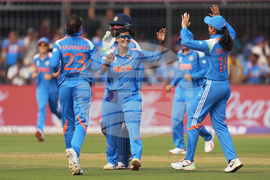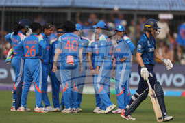India's players celebrates the wicket of England's Heather Knight during the ICC Women's Cricket World Cup match between India and England in Indore, India, Sunday, Oct. 19, 2025. (AP Photo/Ajit Solanki)