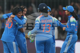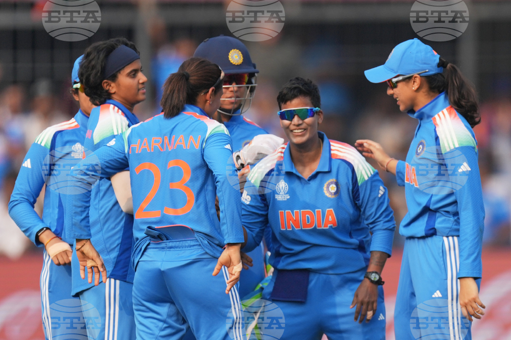 India's Shree Charani, second left, celebrates with teammate the wicket of England's captain Nat Sciver-Brunt during the ICC Women's Cricket World Cup match between India and England in Indore, India, Sunday, Oct. 19, 2025. (AP Photo/Ajit Solanki)