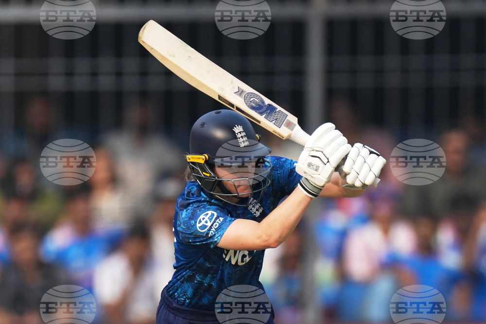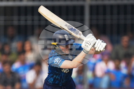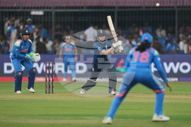 England's Heather Knight, center, plays a shot during the ICC Women's Cricket World Cup match between India and England in Indore, India, Sunday, Oct. 19, 2025. (AP Photo/Ajit Solanki)