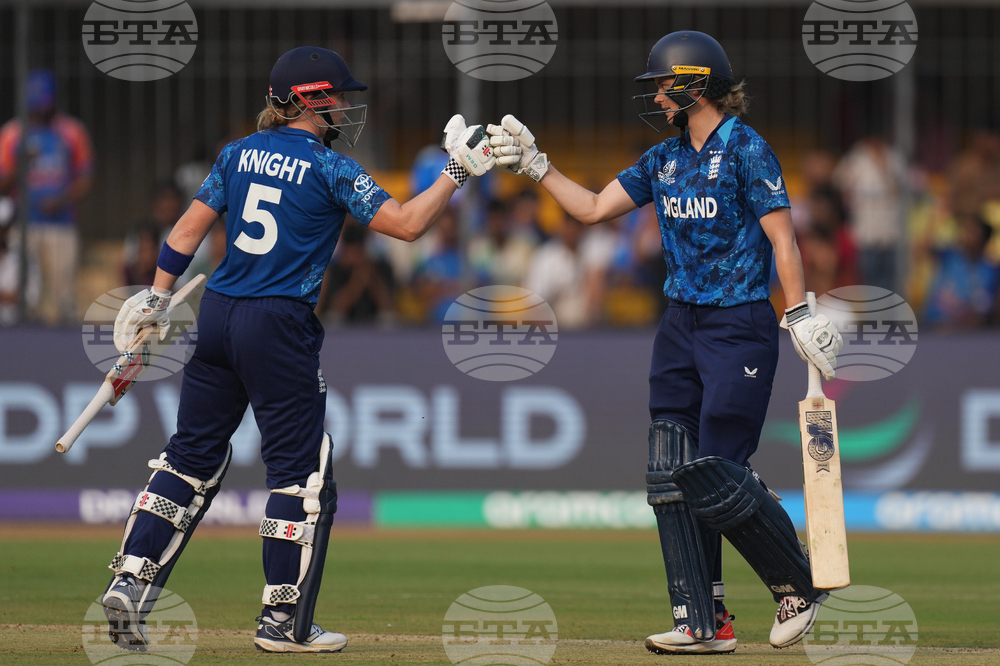 England's captain Nat Sciver-Brunt, left, celebrates with teammate the wicket of India's captain Harmanpreet Kaur during the ICC Women's Cricket World Cup match between India and England in Indore, India, Sunday, Oct. 19, 2025. (AP Photo/Ajit Solanki)