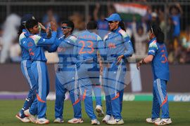 India's Deepti Sharma, center, celebrates with teammate the wicket of England's Tammy Beaumont during the ICC Women's Cricket World Cup match between India and England in Indore, India, Sunday, Oct. 19, 2025. (AP Photo/Ajit Solanki)