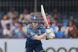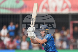England's Heather Knight plays a shot during the ICC Women's Cricket World Cup match between India and England in Indore, India, Sunday, Oct. 19, 2025. (AP Photo/Ajit Solanki)