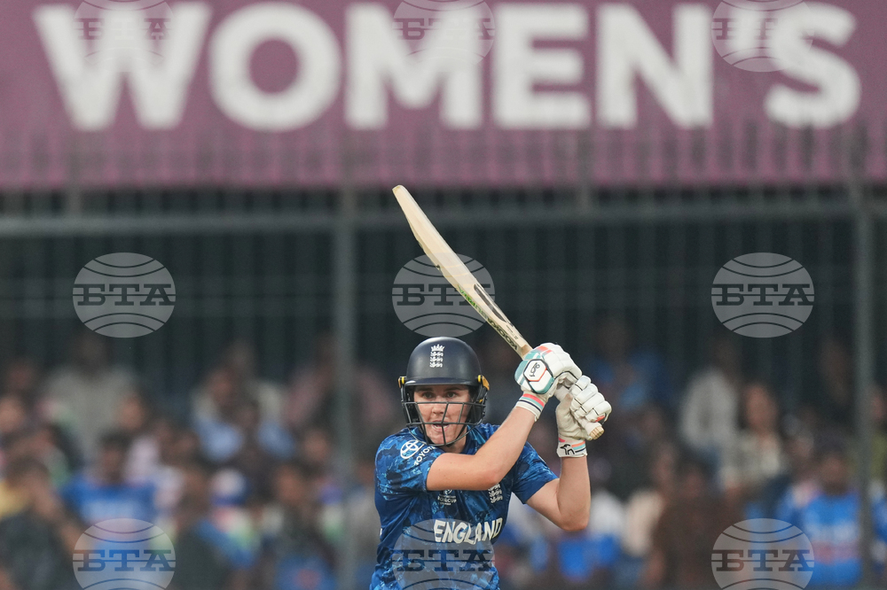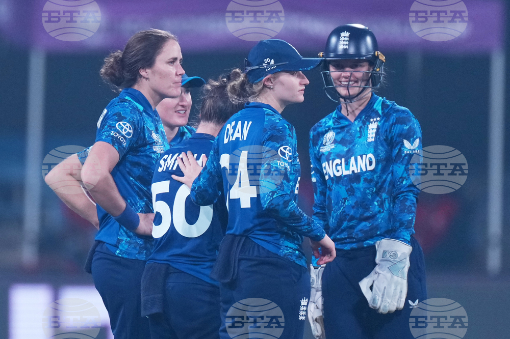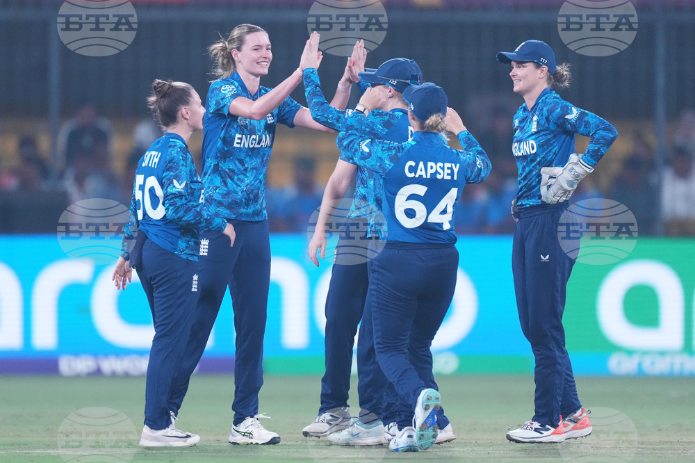 England's Lauren Bell, second left, celebrates with teammate the wicket of India's Pratika Rawal during the ICC Women's Cricket World Cup match between India and England in Indore, India, Sunday, Oct. 19, 2025. (AP Photo/Ajit Solanki)