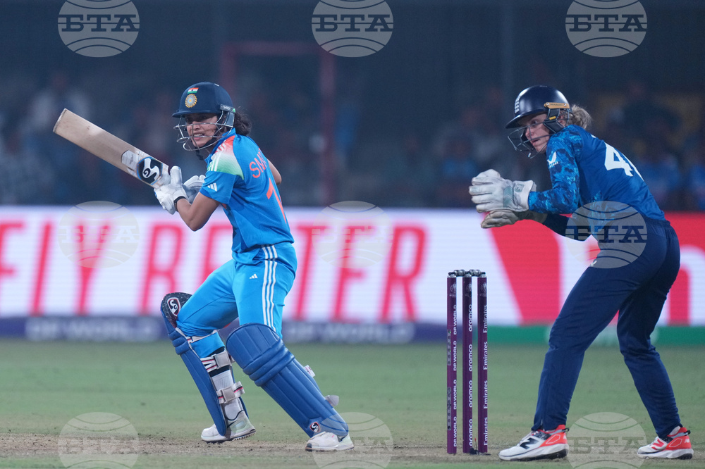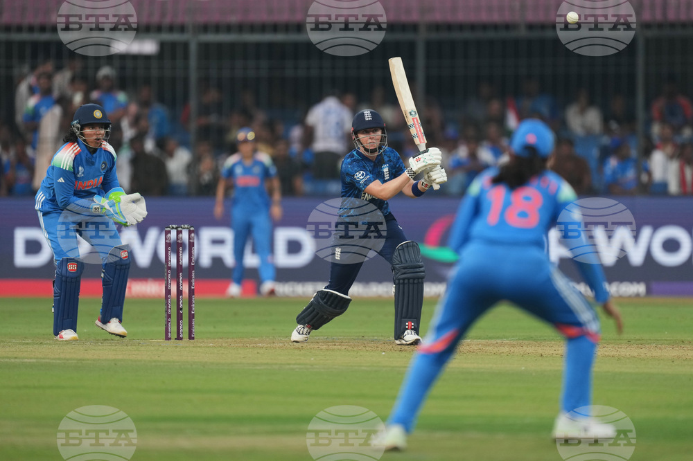 India's Shree Charani, left, tries to run out England's Charlotte Dean, right, during the ICC Women's Cricket World Cup match between India and England in Indore, India, Sunday, Oct. 19, 2025. (AP Photo/Ajit Solanki)