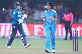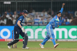 India's Deepti Sharma, right, bowls a delivery during the ICC Women's Cricket World Cup match between India and England in Indore, India, Sunday, Oct. 19, 2025. (AP Photo/Ajit Solanki)