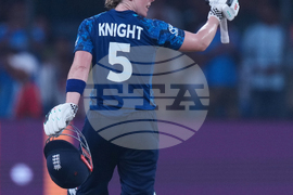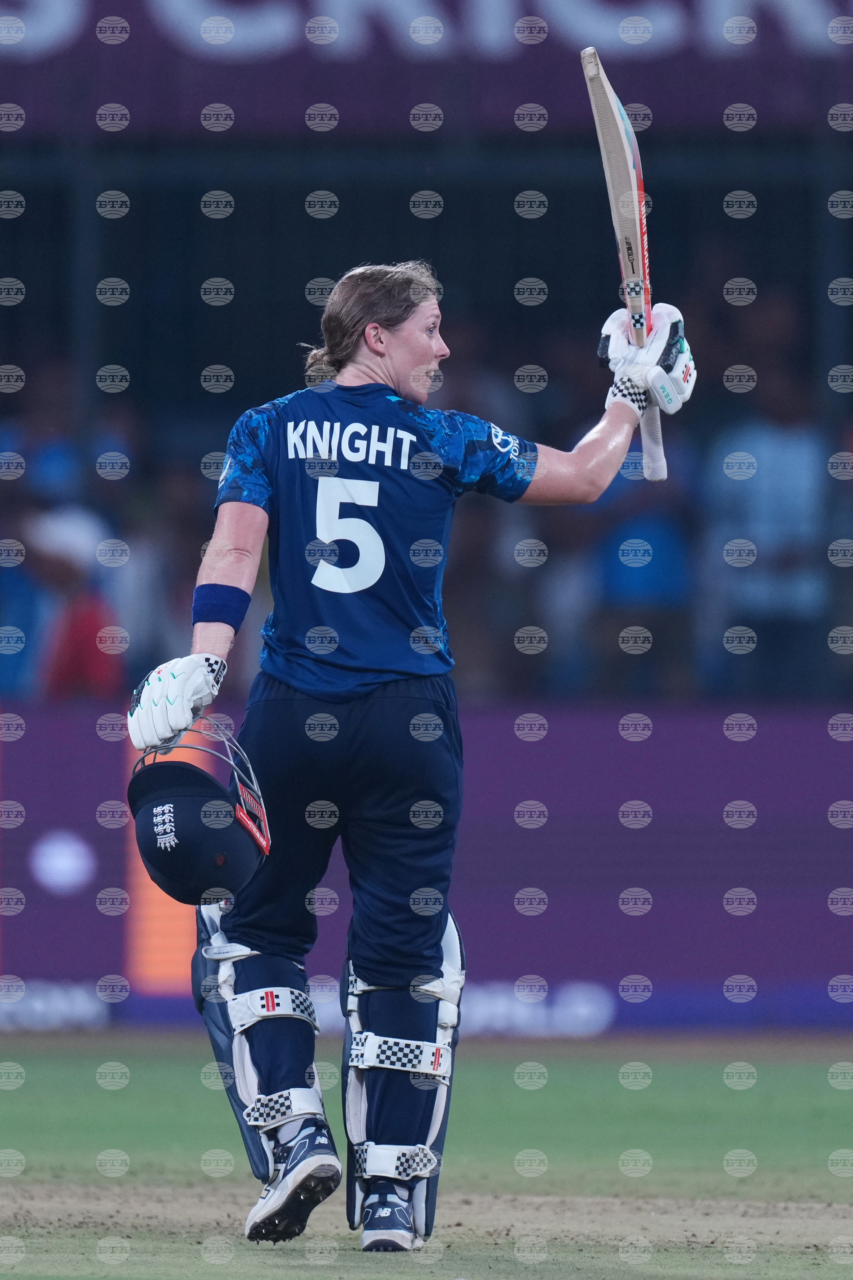 England's Heather Knight celebrates her century during the ICC Women's Cricket World Cup match between India and England in Indore, India, Sunday, Oct. 19, 2025. (AP Photo/Ajit Solanki)