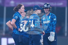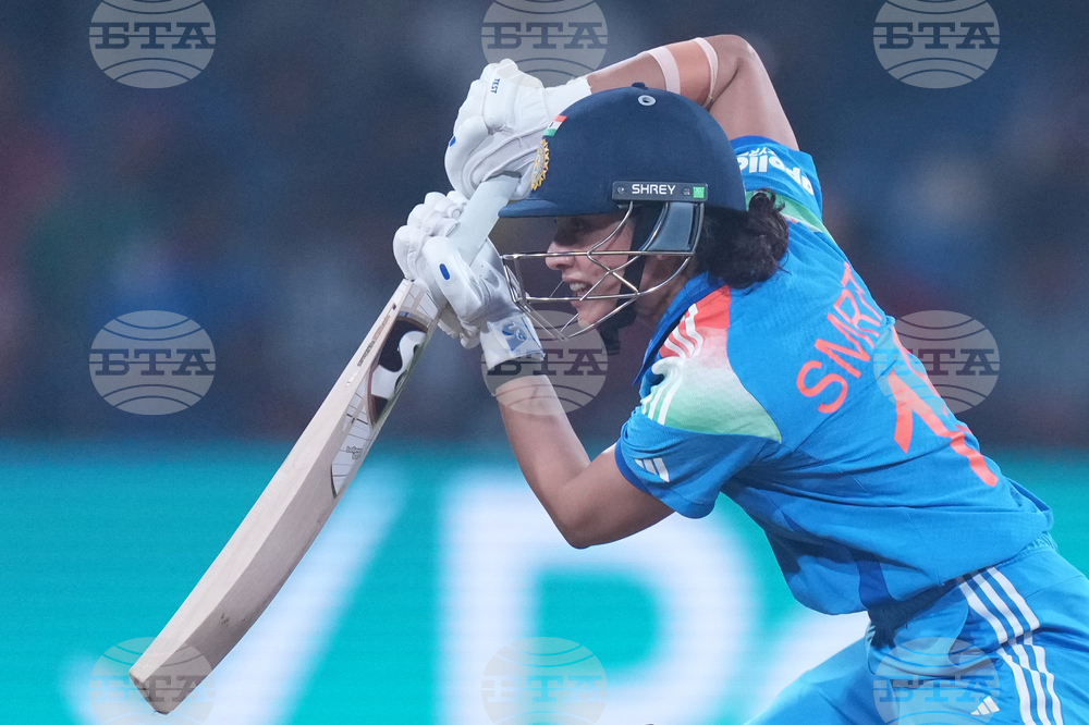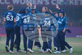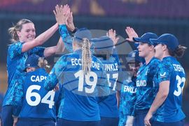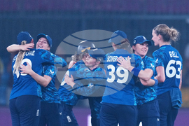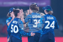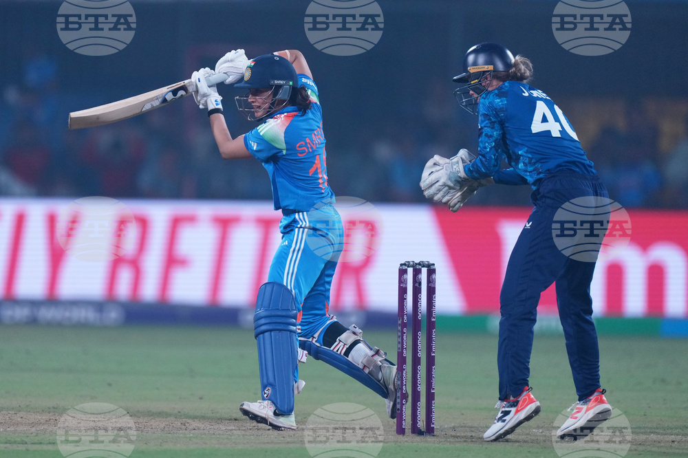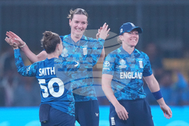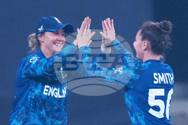 England's Linsey Smith, center, celebrates with teammate the wicket of India's Smriti Mandhana during the ICC Women's Cricket World Cup match between India and England in Indore, India, Sunday, Oct. 19, 2025. (AP Photo/Ajit Solanki)