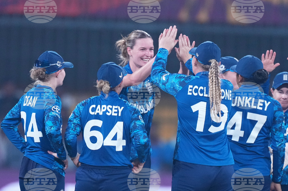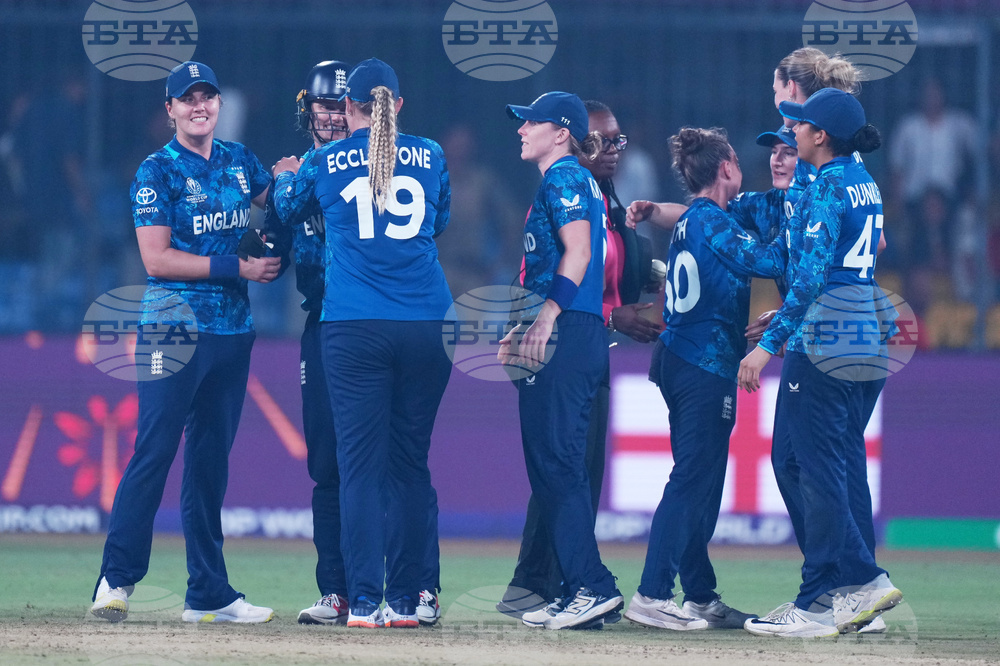 England's Sophie Ecclestone, center, celebrates with teammate the wicket of India's Deepti Sharma during the ICC Women's Cricket World Cup match between India and England in Indore, India, Sunday, Oct. 19, 2025. (AP Photo/Ajit Solanki)