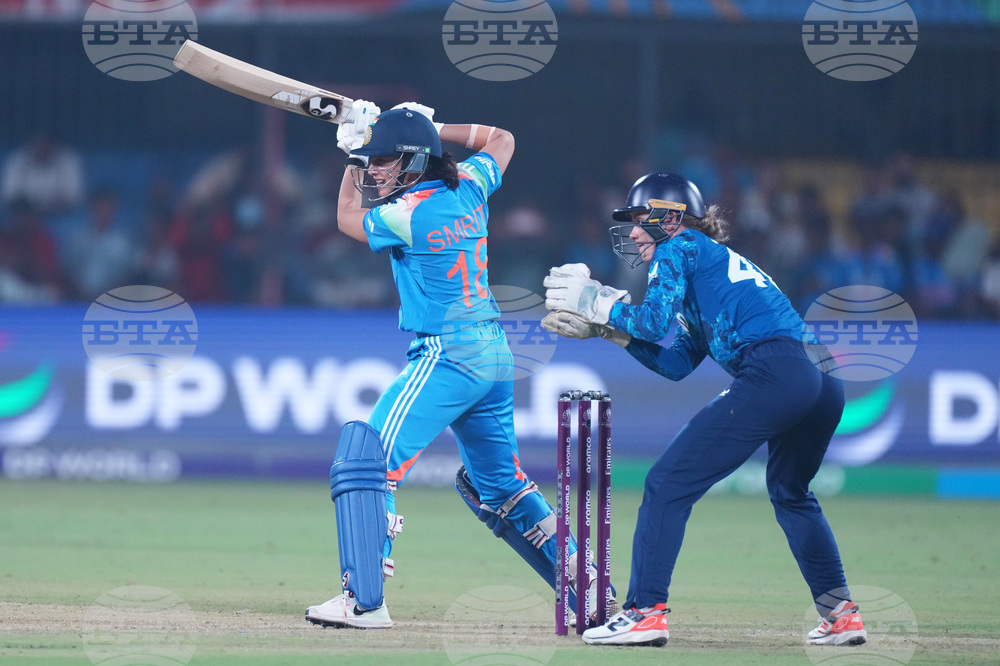 England's Linsey Smith, right, celebrates with teammate the wicket of India's Smriti Mandhana during the ICC Women's Cricket World Cup match between India and England in Indore, India, Sunday, Oct. 19, 2025. (AP Photo/Ajit Solanki)