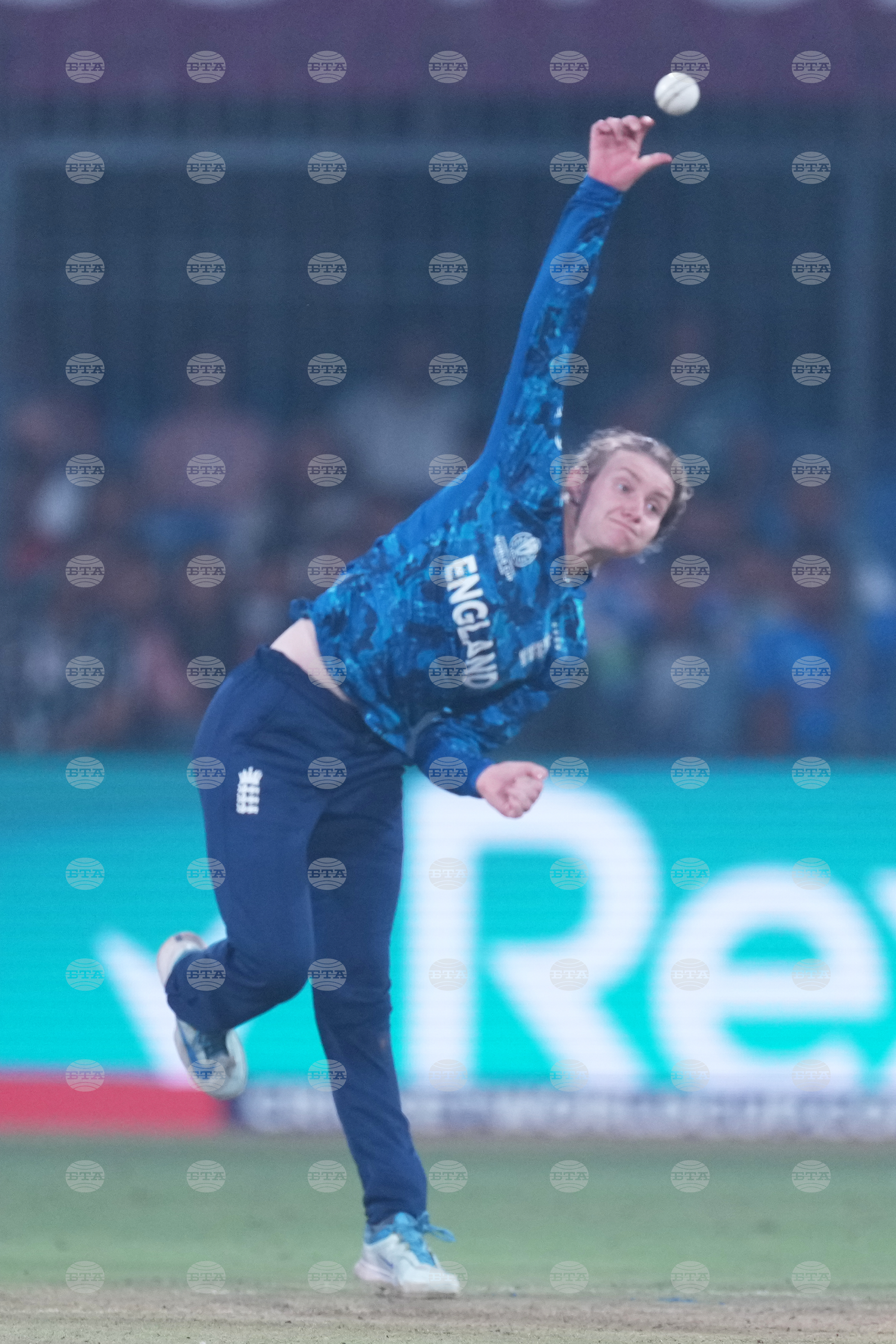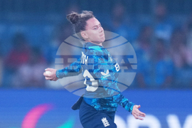 England's Linsey Smith bowls a delivery during the ICC Women's Cricket World Cup match between India and England in Indore, India, Sunday, Oct. 19, 2025. (AP Photo/Ajit Solanki)