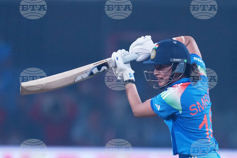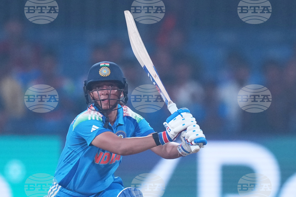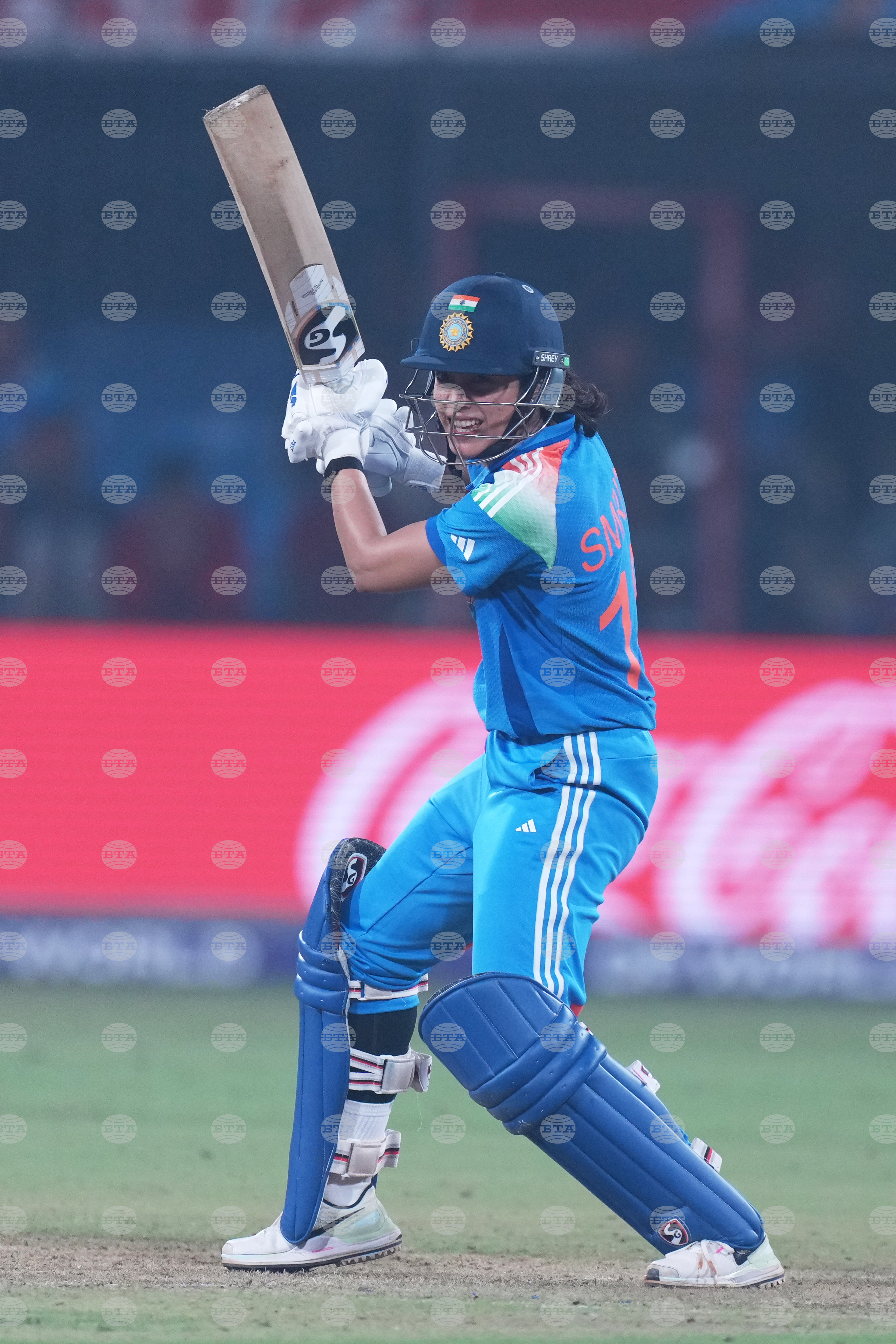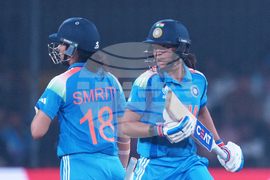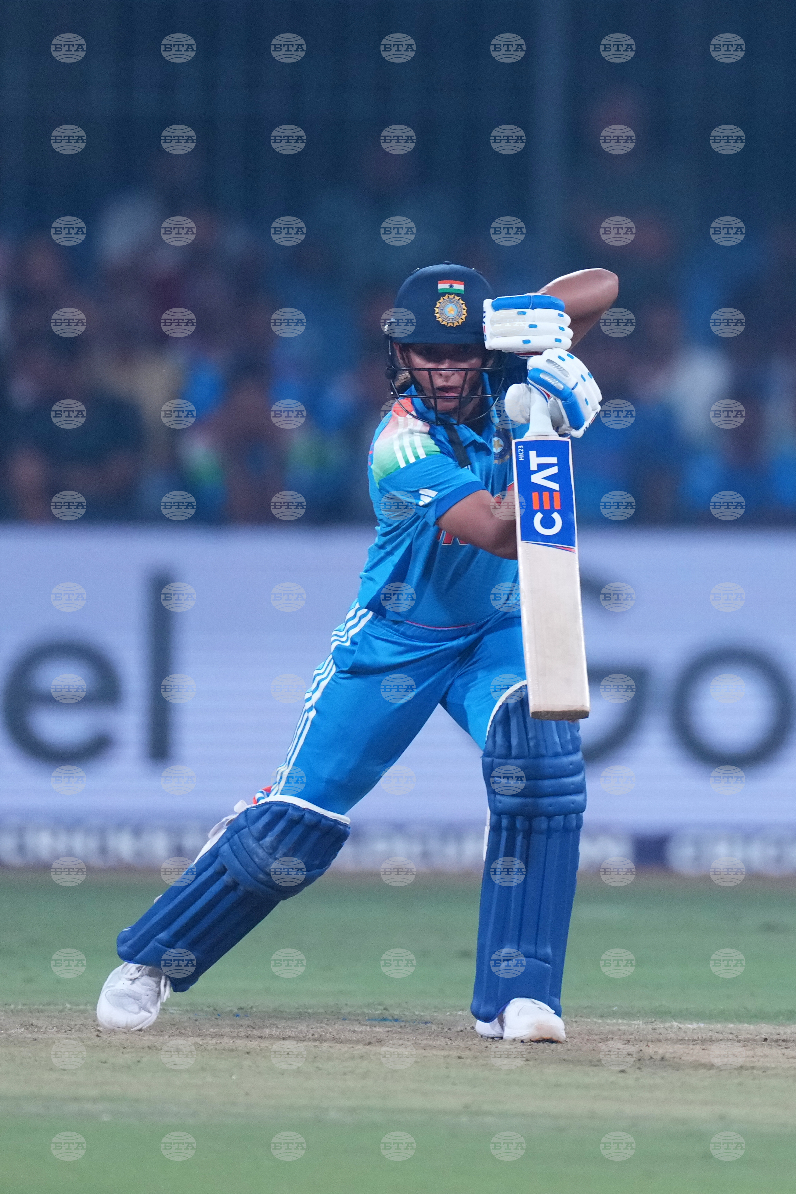 India's Smriti Mandhana, left, plays a shot during the ICC Women's Cricket World Cup match between India and England in Indore, India, Sunday, Oct. 19, 2025. (AP Photo/Ajit Solanki)