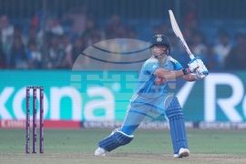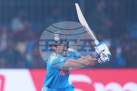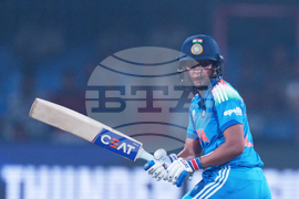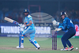 India's Harleen Deol plays a shot during the ICC Women's Cricket World Cup match between India and England in Indore, India, Sunday, Oct. 19, 2025. (AP Photo/Ajit Solanki)